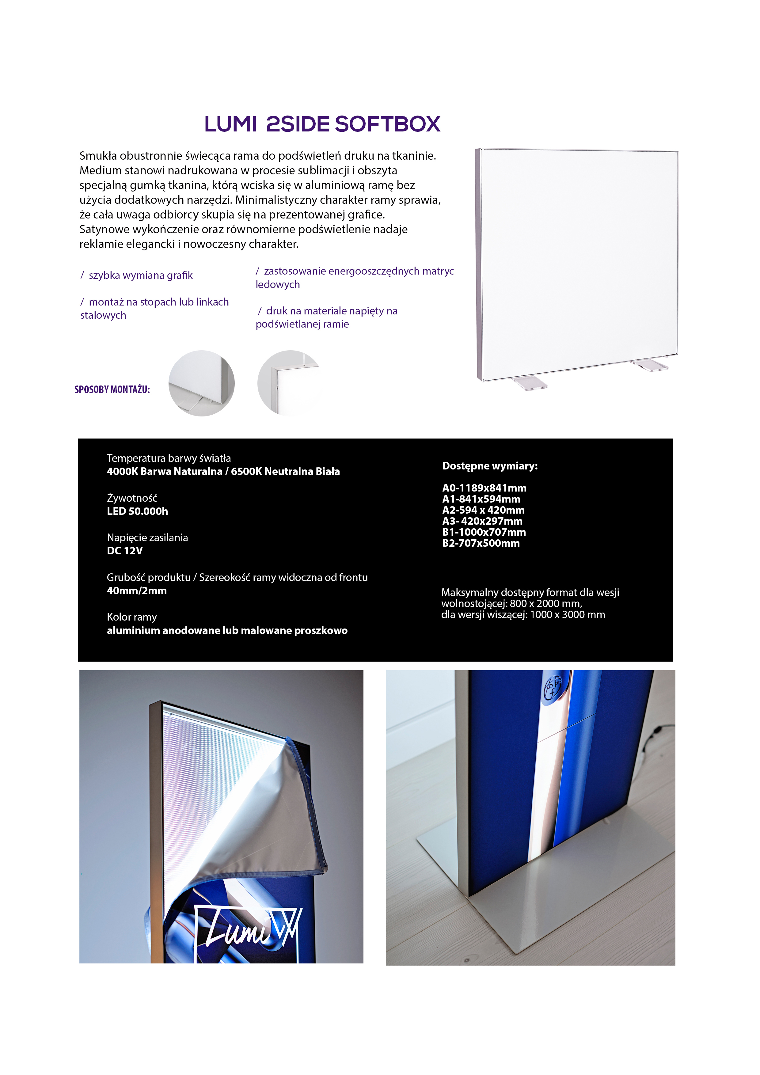 40 MM DEEP TWO SIDE ILUMINATED ALUMINIUM FRAME. REPLACABLE GRAPHIC PRINT, THANKS TO THE SILICON EDGING TECHNOLOGY.