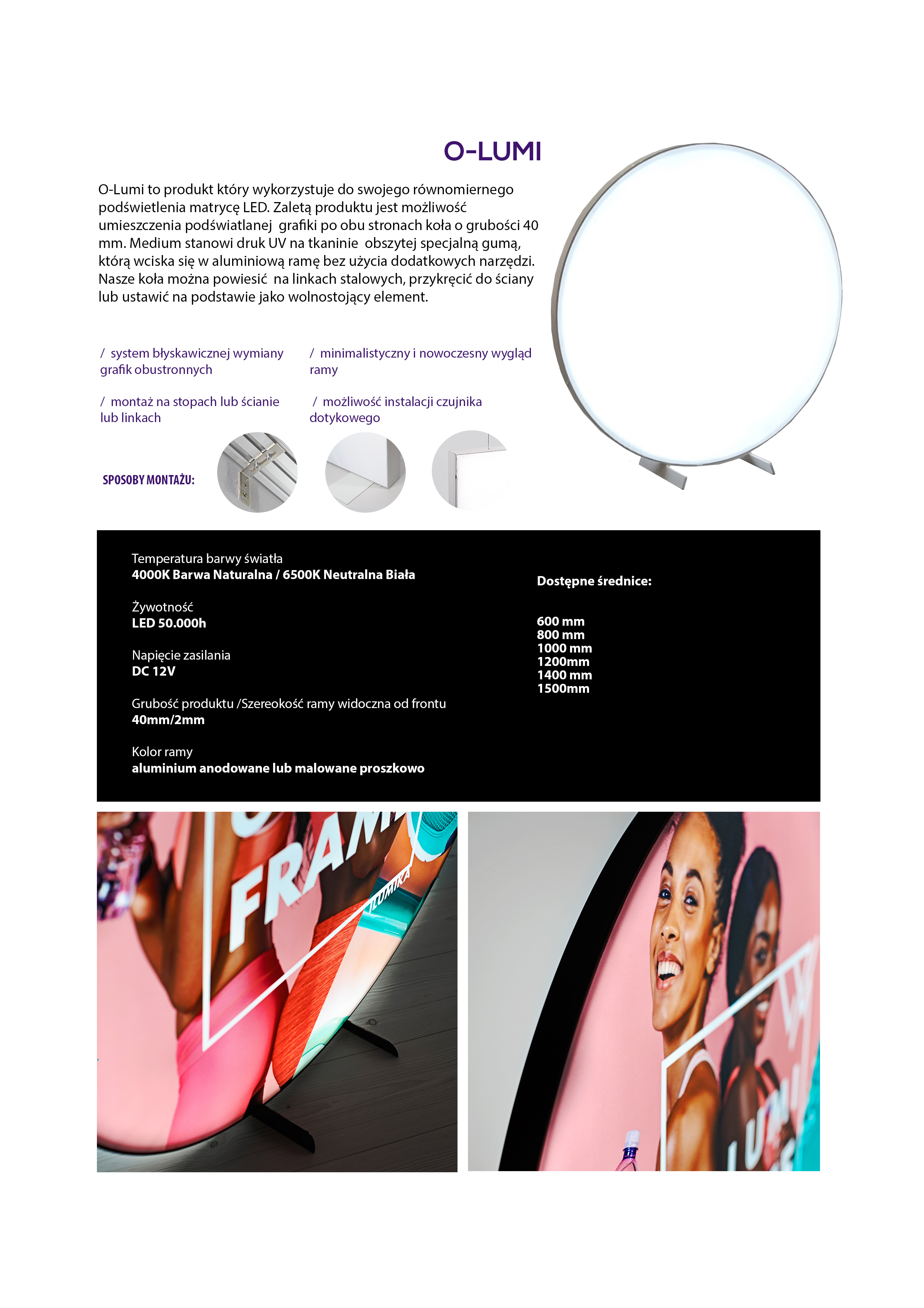 ROUND, TWO-SIDED ILLUMINATED DISPLAY. PRINT CAN QUICKLY AND EASILY BE EXCHANGED WITH OUT USING TOOLS, THANKS TO THE SILICON EDGING TECHNOLOGY.